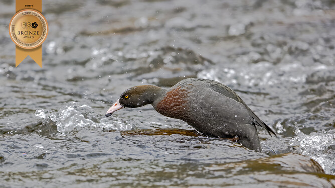 A Blue Duck (Whio) clambers over a rock through the rapids of the Tongariro River in Turangi, New Zealand.