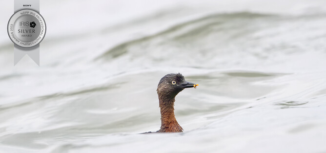 A New Zealand dabchick photographed with a morsel of food in its beak as it navigated the choppy waves of Lake Rotorua.