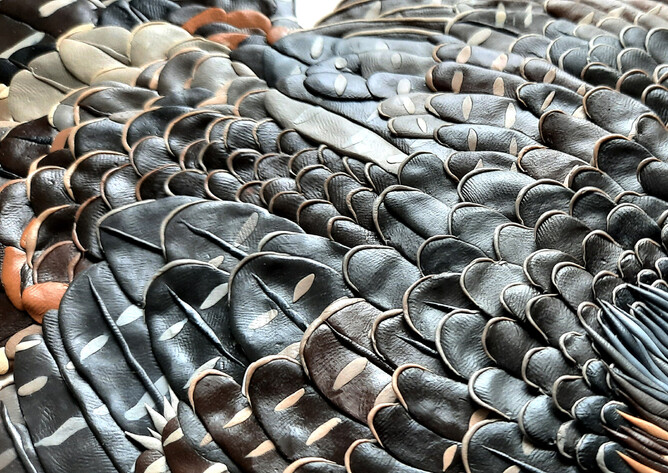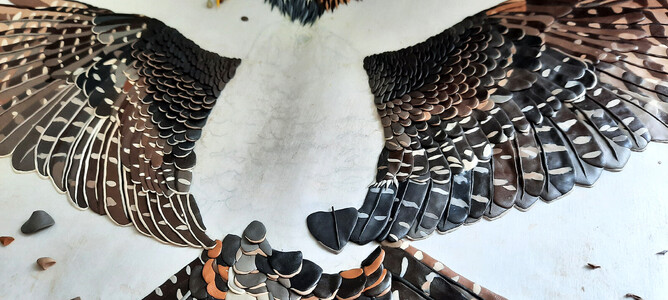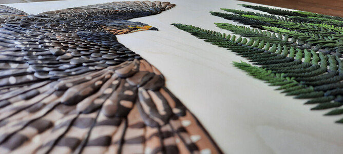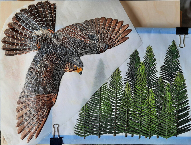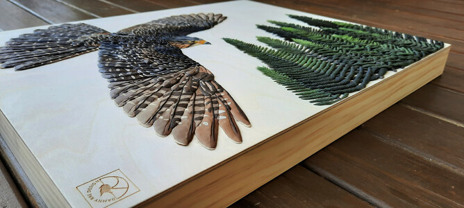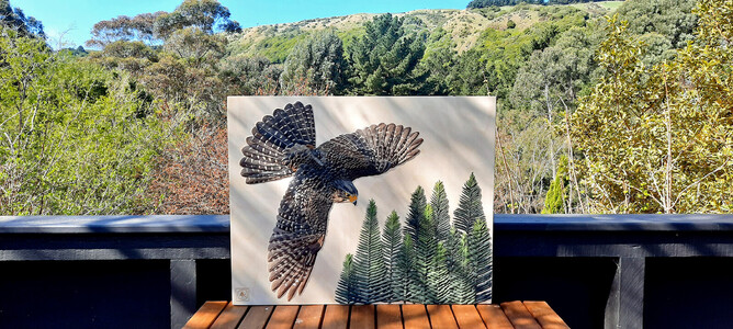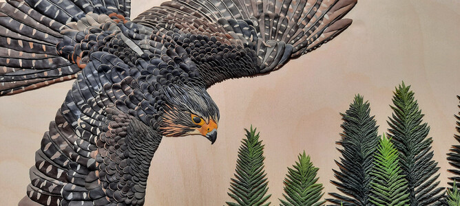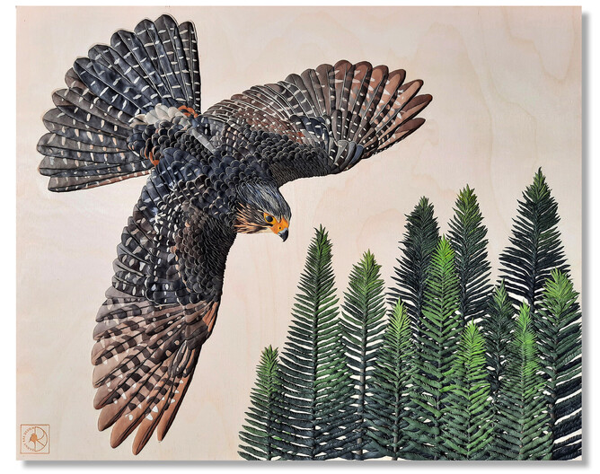The Kārearea in the artwork is 'Hatupatu' - an adult male New Zealand Falcon that was released from Rotorua Museum in 2013 as part of the 'On The Wing' project - a joint project between Rotorua Museum and Wingspan Birds of Prey Trust