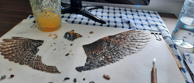 When the opportunity arose to collaborate with her on a Kārearea commission, I was more than happy to offer one of my images as inspiration for the piece. The images below showcase the journey the artwork has taken from inception to completion. It's always nice to see how an artist converts one of my images into his/her own art form. The intricate detail that Danny has managed to achieved is mind-blowing.