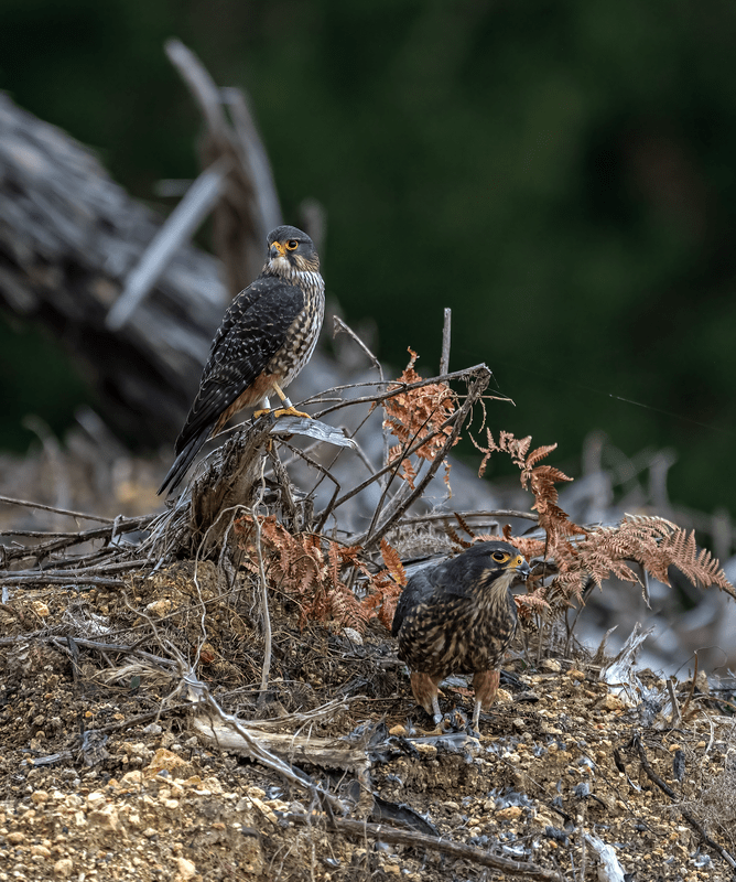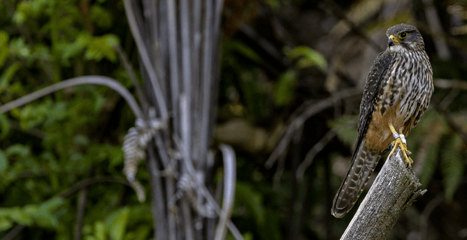 At the end of 2014, two female juvenile kārearea were released from the museum. One of them was called Maia (single orange band). We knew we were tempting fate when we put an orange band on Maia, the same colour band as that of Maureen - Hatupatu's first love. While Hatupatu spent a lot of time out in the forest, he would keep coming back to the Museum at least twice a day to partake in the supplementary food that the volunteers would put out for him (and now for the two newly released falcons). It was only a matter of time before Hatupatu set his eyes on Maia and eventually he lured her away from the Museum to his little slice of paradise in the forest - a bond that would last for the next four years.