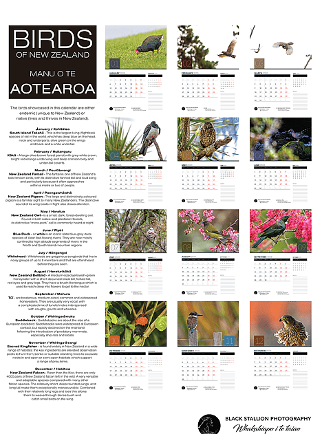 These calendars were produced as a means of raising funds for the work that Wingspan does in the area of Birds of Prey Conservation in New Zealand. All images used are Black Stallion Photography images.